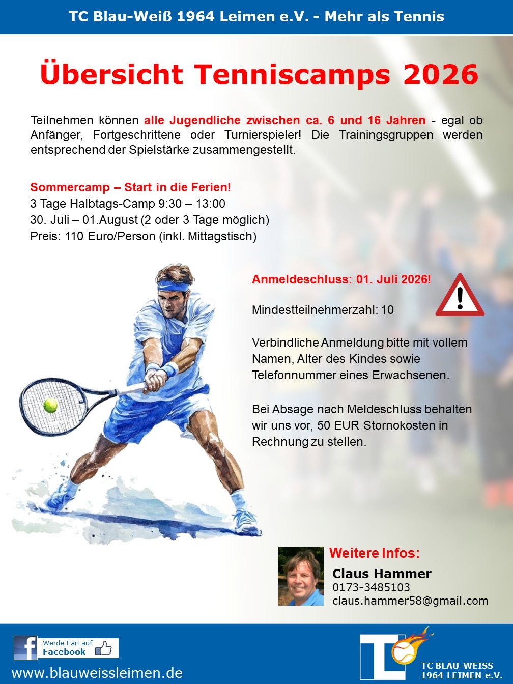Bei Fragen und zur Anmeldung darf man sich gerne an Claus Hammer unter 0173 348 5103 wenden. Der TC Blau-Weiß Leimen freut sich über viele neue Kinder mit Spaß am spielerischen Umgang mit dem Ball und am Tennis! Spätere Tenniskarriere nicht ausgeschlossen…
