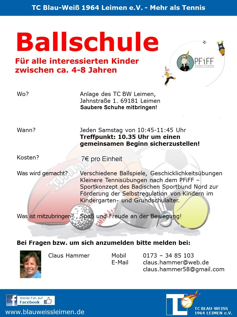 Bei Fragen und zur Anmeldung darf man sich gerne an Claus Hammer unter 0173 348 5103 wenden. Der TC Blau-Weiß Leimen freut sich über viele neue Kinder mit Spaß am spielerischen Umgang mit dem Ball und am Tennis! Spätere Tenniskarriere nicht ausgeschlossen…